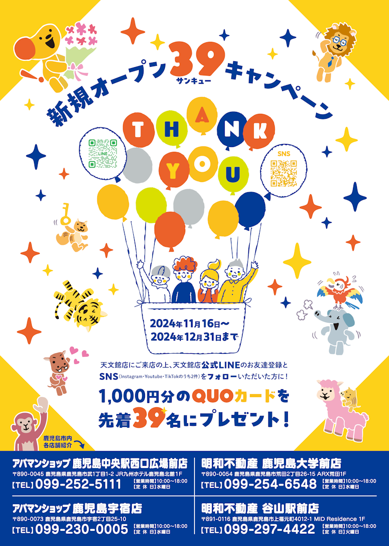■対象:天文館店にご来店の上、天文館店公式LINEのお友達登録とSNS(Instagram・YouTube・TikTokのうちいずれか2件)をフォローいただいた方